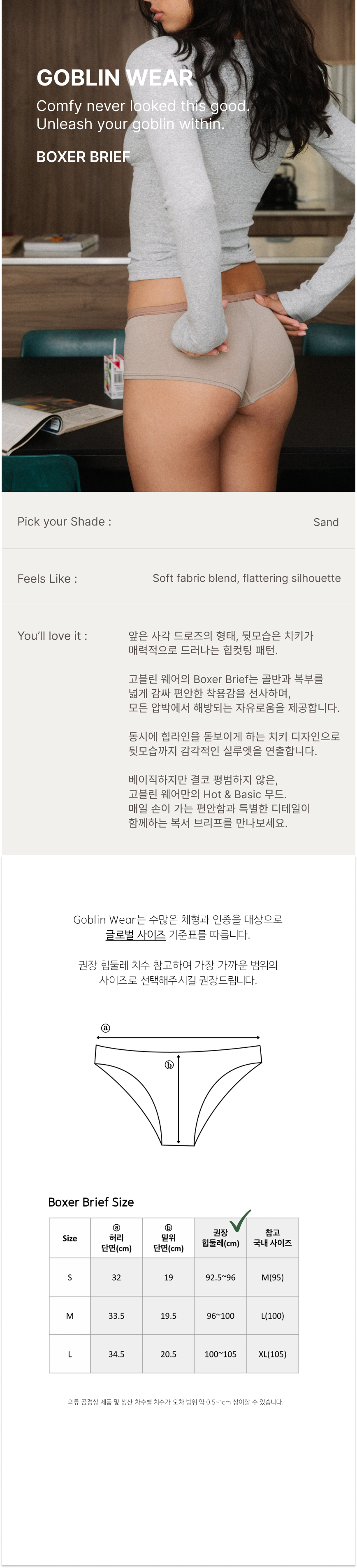원단 특성, 신축성에 따라 동일 사이즈라도 디자인별 실측 및 패턴 차이가 있으며 최적의 피팅을 위한 설계로 불량이 아닌 점 참고 부탁드립니다.